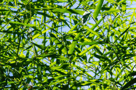 Bamboo leaves in shallow focus and blue sky for natural background