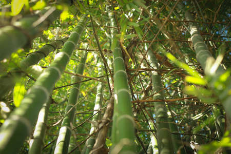 Bamboo forest flourish green in sunshine, morning foliage background.. Bamboo trunks in a dense forest