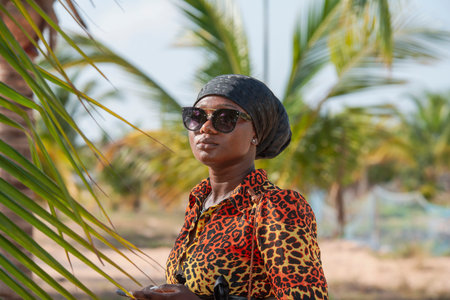Woman with black headdress and sunglasses protecting from the sun on a beach in Keta Ghana West Africa