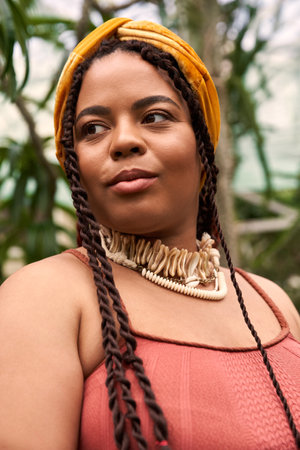 Portrait of woman with braided hair looking straight at camera, surrounded by vibrant greenery. Capturing natural ambiance and peaceful expression as background blends with flora