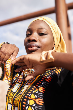 Fashion portrait of African American woman wearing traditional dress and dancing in desert sunlight
