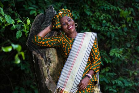 African woman in multicoloured ethnic clothing sitting in a park while smiling