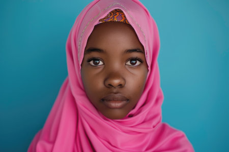 A young girl wearing a pink scarf with a blue background. She has a serious expression on her face