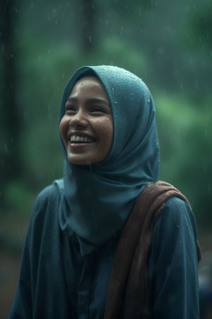 A cheerful young woman with a radiant smile is adorned in a vibrant floral scarf, exuding warmth and positivity. Her bright expression and the colorful scarf create a captivating blend of joy and style, inviting viewers to share in her happiness.