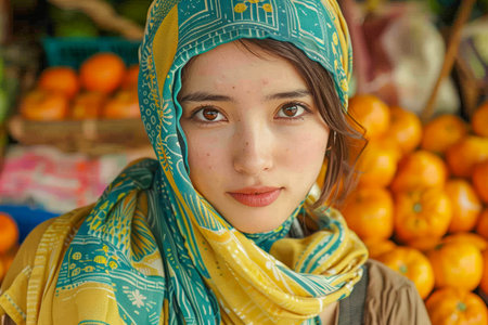 Portrait of a Young Woman in a Colorful Scarf at a Vibrant Fruit Market AI Generative