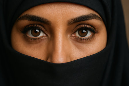 Close-up portrait of a woman wearing a black niqab, showing her expressive eyes and natural beauty, representing modesty, culture, and traditional Islamic attire.