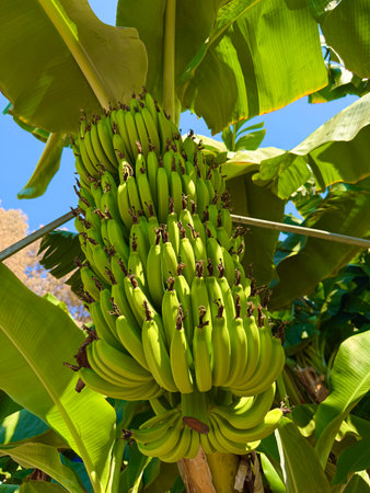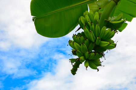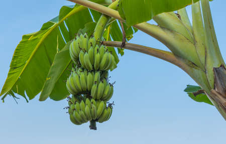 Banana tree with bunch of unripe bananas. Banana plantation with blue sky on sunny day.