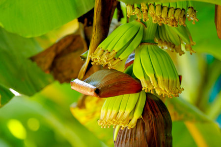 Fresh banana tree branch macro close up view