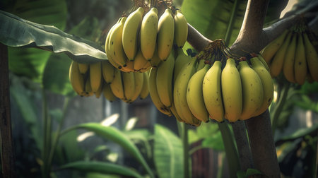 Green yellow bananas are growing on banana plant tree in Southeast Asia.
