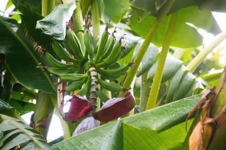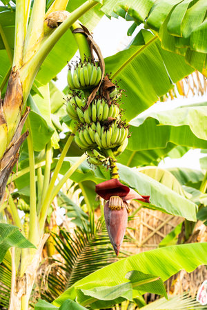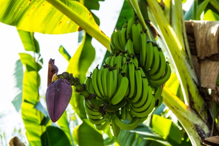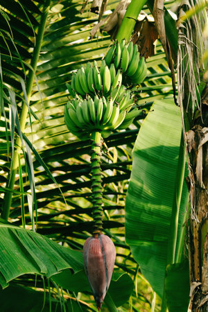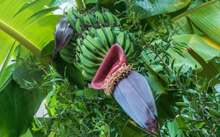 Banana flower and unripe fruits on a tree in the garden