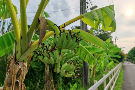 Green young bananas hanging on the tree at farm along street in tropical country, Thailand.