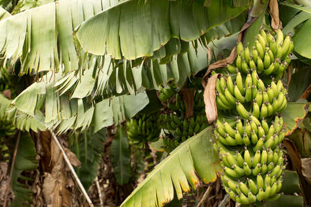 Banana plantation, bunch of green banana riping on banana tree, Canary Islands