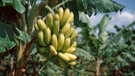 healthy raw banana bunch on tree in firm