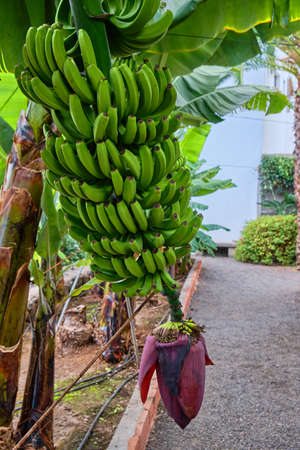 Bunch of banana fruits on palm tree, growing in the garden.