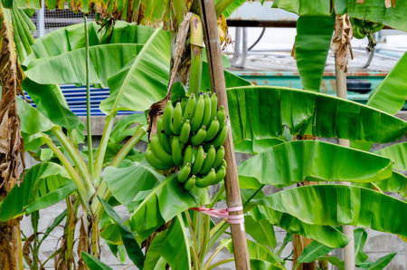 Green yellow bananas are growing on banana plant tree in Patong Beach Kathu District Phuket Island Province Southern Thailand in Southeast Asia.