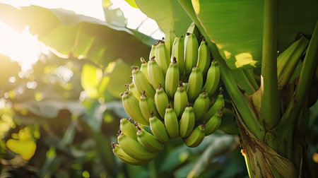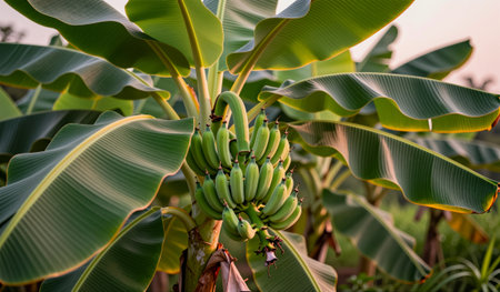 A luscious cluster of green bananas hangs from a robust stem amidst the vibrant leaves of a tropical plant. The warm glow of the setting sun highlights their freshness, creating a serene scene.