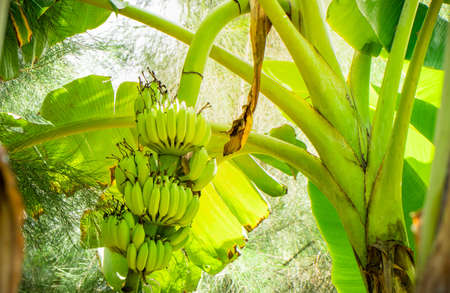 Organic young green banana fruits on tree with sunshine in the sunny day. Bunch of fresh raw young green banana fruit on tree in the orchard.