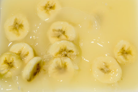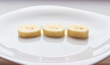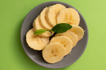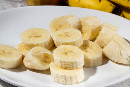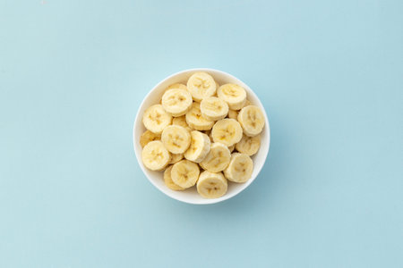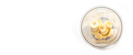 Banana cut into slices in a transparent container on a white background. Top view, flat lay. Banner.
