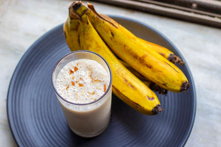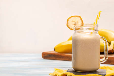 Fruit Smoothies. banana smoothies with milk. Banana Smoothie on a wooden table. Healthy breakfast: banana smoothie with oatmeal. Banana smoothie in glass with fresh fruits on wooden background