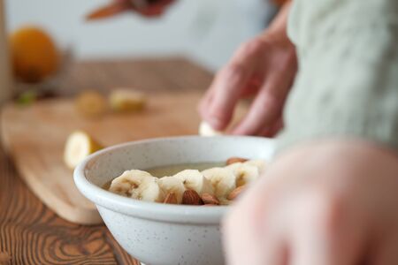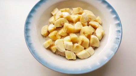 Vertical closeup pan of healthy breakfast, oatmeal porridge with milk and banana. Oat flakes filled with milk in a faience dish on a white background. Organic food concept for strong muscles.