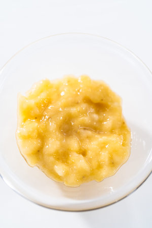 Banana mousse at pan standing at the stove and preparing for the future cakes