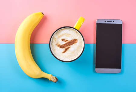 Coffee cappuccino with a picture of the airplane on the foam, top view. Pastel bright background. The concept of air travel.