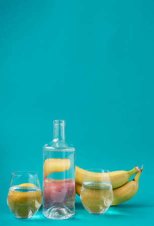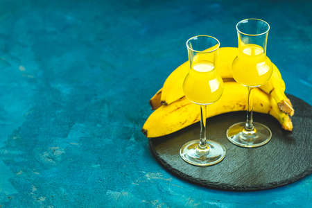 Banana flavoured liqueurs, which French call creme de banana, in grappas wineglass on dark blue concrete surface. European aperitif drink. Selective focus, shallow depth of the fields, copy space.