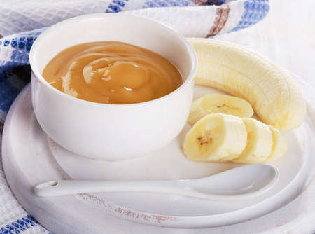 Homemade cultivated banana in coconut milk recipe on white background. One of popular traditional dessert of Thailand and Southeast Asia.
