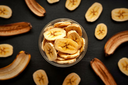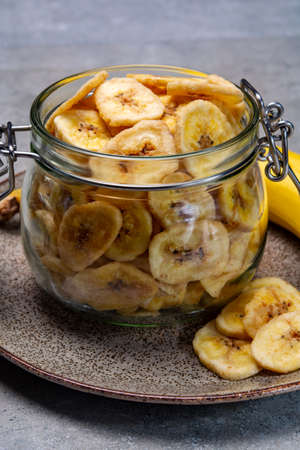 Healthy sweet snack, crispy dehydrated unsugared banana chips in glass jar