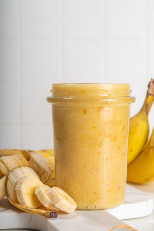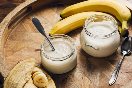 sweet homemade yogurt with fresh bananas and slices of oatmeal cookies in a glass jar