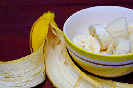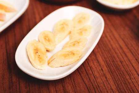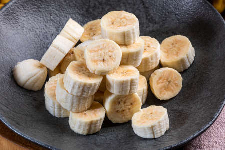simple food ingredients concept, sliced banana in wooden bowl with melted cocoa powder coating