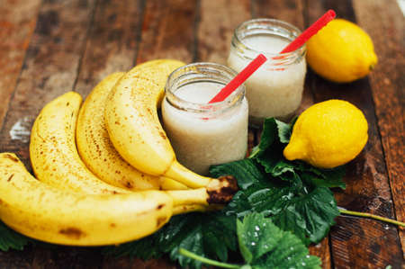 Banana smoothie with a paper tube and mint. Bananas are whole and cut on a gray background