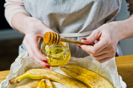 The chef pours honey slices of bananas in a baking dish. Cooking baked bananas. Black background, side view, kitchen
