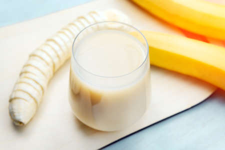 Traditional banana milk in a glass and ripe banana on yellow podium. Concept of a vegan alternative to traditional milk.