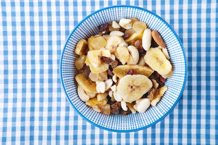 Healthy vegetarian cereal breakfast. Nuts, raisin, fruit and dry fruit pieces in a bowl on checkered table cloth.
