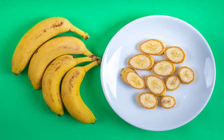 Baked banana chips in a white bowl and a bunch of bananas on the table. Fast food. Copy space