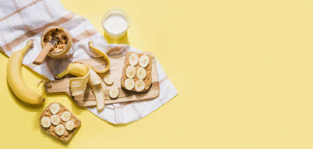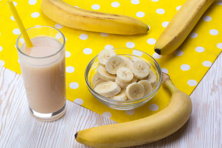 Banana smoothie, yogurt or milkshake cocktail, organic healthy drink with fresh bananas on yellow bright background copy space