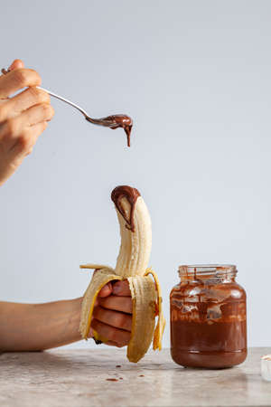 A caucasian woman is spreading a spoon of hazelnut flavored sweet cocoa spread on a peeled banana for a snack. This is a very sweet delicious and convenient dessert for those carving for some sugar.