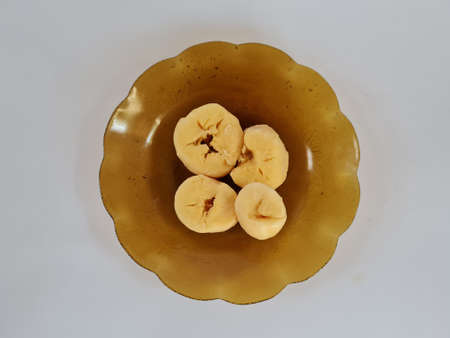 Pisang Kukus or Steamed Banana, Indonesian traditional food, a healthy snack. Served in small bowl on wooden table. Close up.