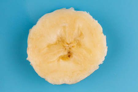Peeled yellow banana fruit near blue background space for text, healthy concept