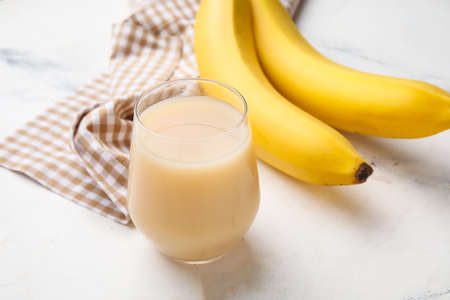Glass of banana milkshake or smoothie and banana on white background, selective focus