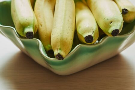 A bunch of bananas and a sliced banana on a plate on a table. Selective focus.