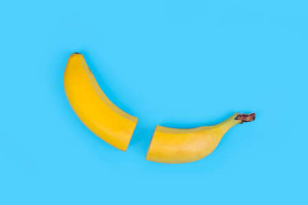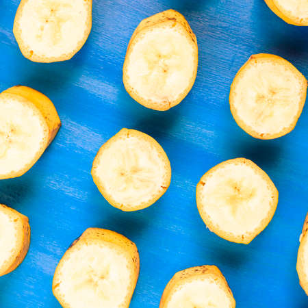 Creative minimalism concept. Unexpected concept. Flat lay view of banana fruit pattern over colorful blue and yellow background.