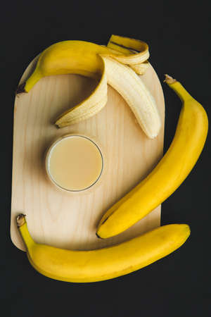 banana juice with bananas on the Board top view on a black background. Natural homemade drink cocktail with fruit for proper nutrition.