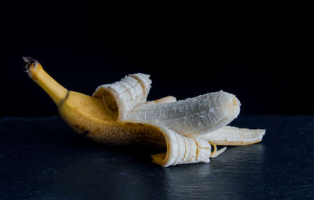Half-eaten banana with shadow on the glass, Open Banana isolated on a outdoor background.