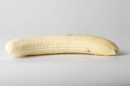 A peeled ripe banana lying flat on a white surface, with its smooth surface gleaming under the soft lighting, ready for consumption