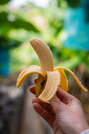 Hand holds a partially peeled banana on Madeira Island, Portugal