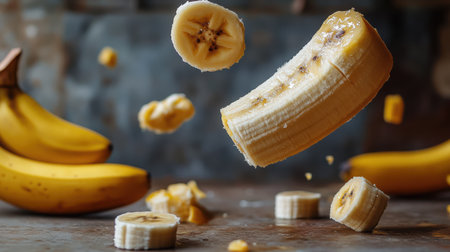 Fresh Sliced Bananas Falling with Crumbs Against a Bright Blue Background Levitation Concept in High Resolution AI Generative
