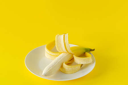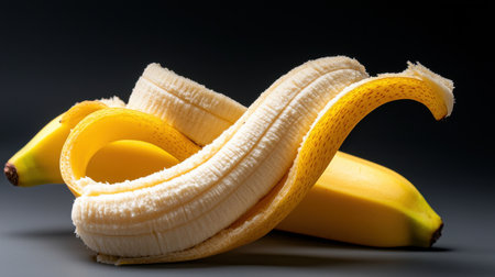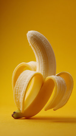 This captivating image showcases a partially peeled banana against a vibrant yellow backdrop. The composition offers a detailed view of the ripe fruit. Perfect for food related projects.