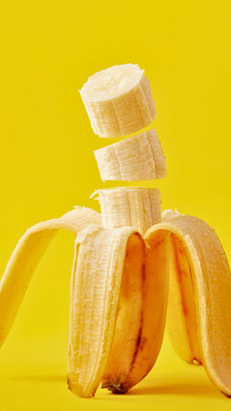 A partially peeled banana is sliced into three segments, stacked vertically against a bright yellow backdrop, creating a visually striking composition.